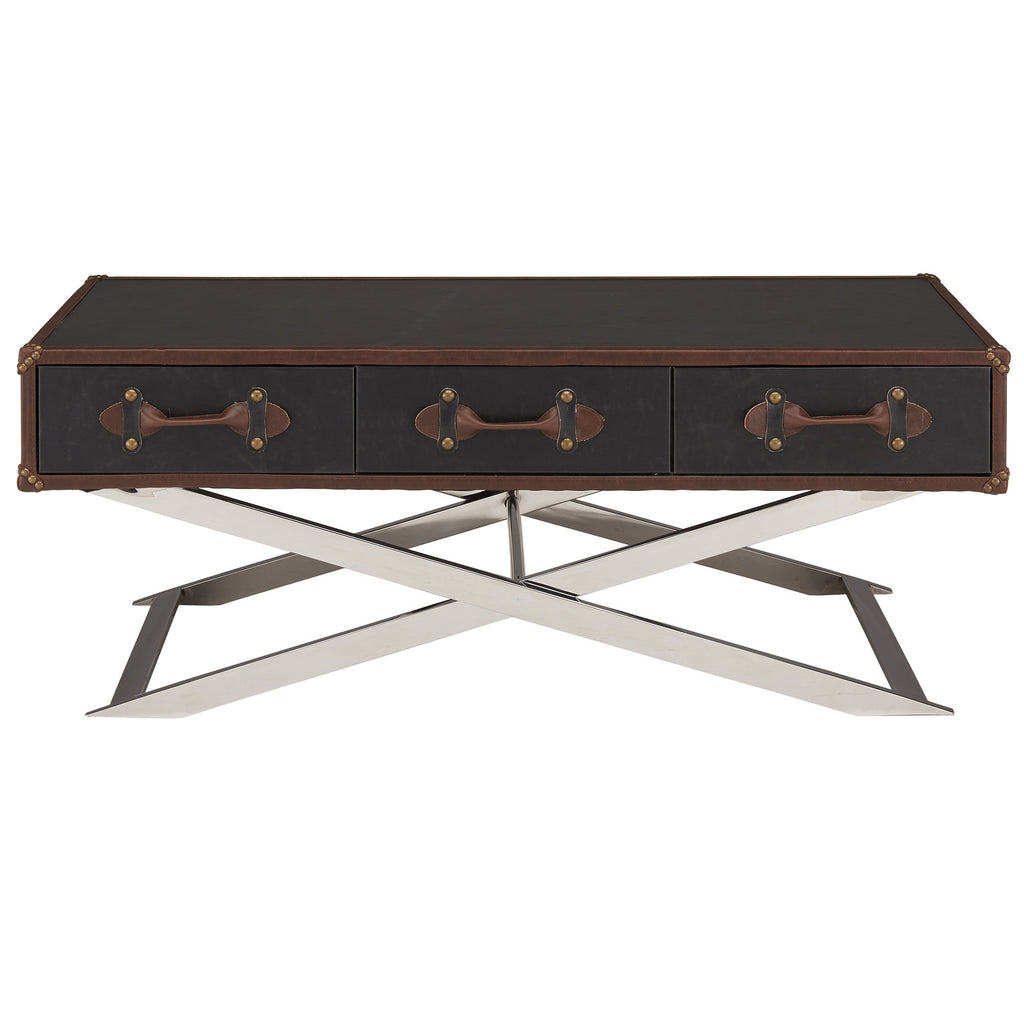 - Weathered, dark grey faux leather upholstery on table with brown faux leather framing and accents