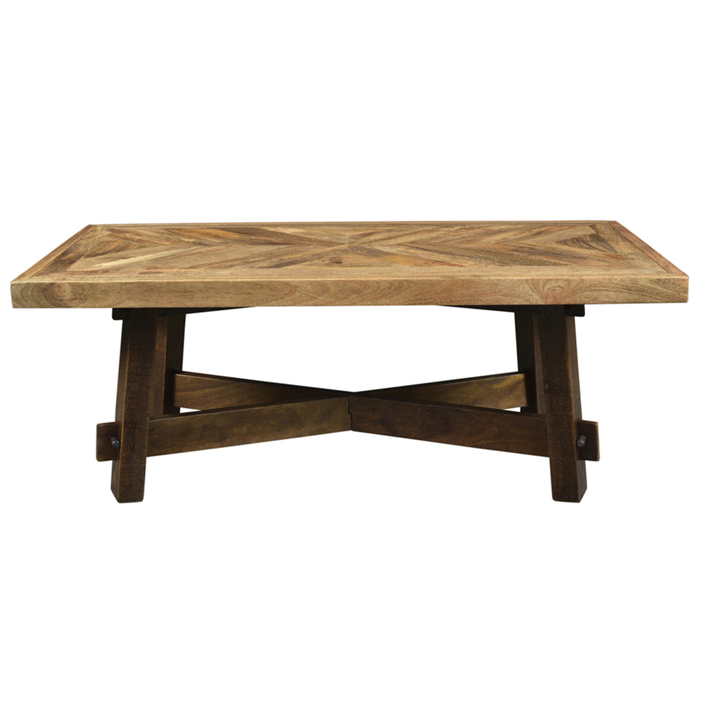 - Table top made of natural-finished mango wood tiles laid together in a geometric pattern