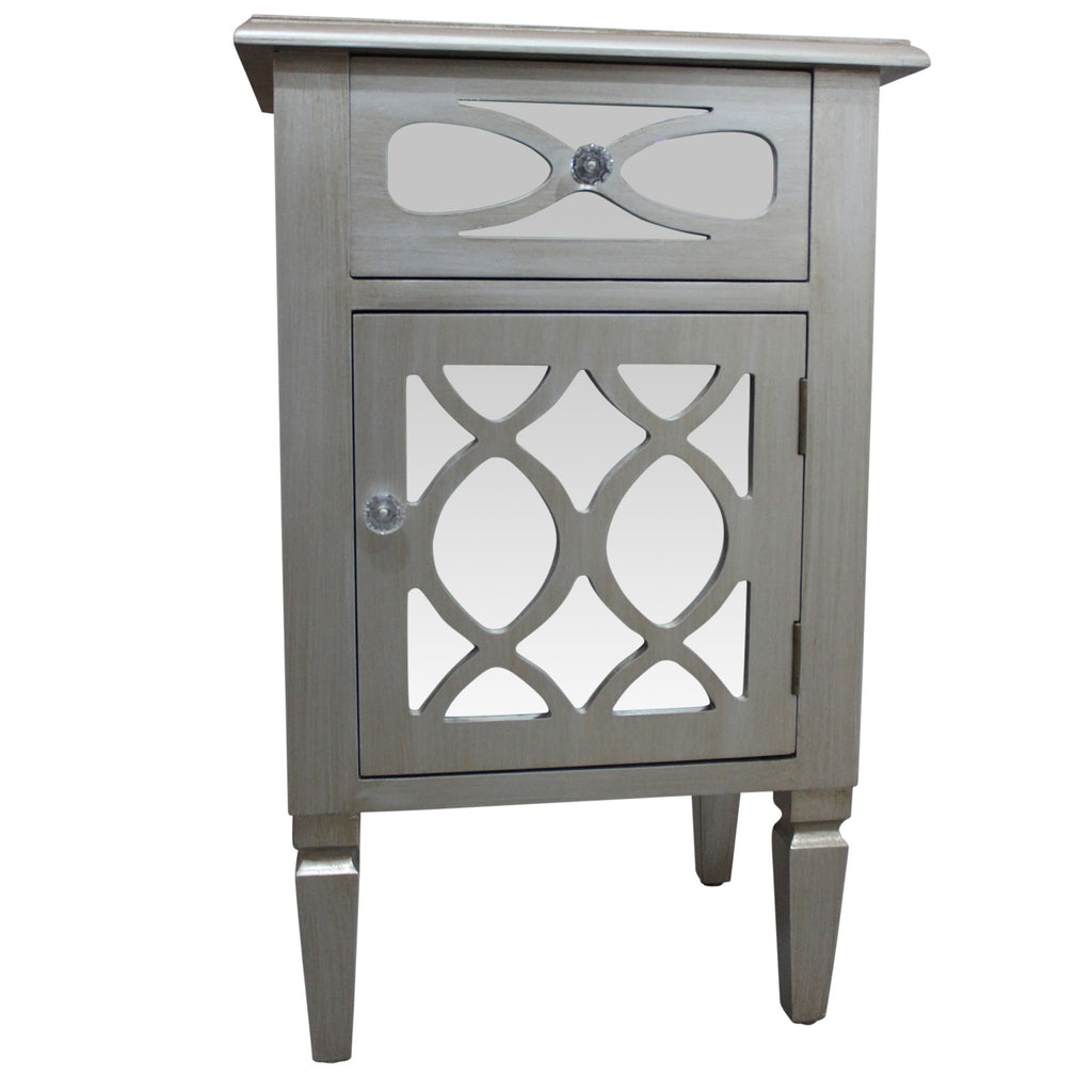 - Wooden overlay pattern on drawer and door front with mirrored backing