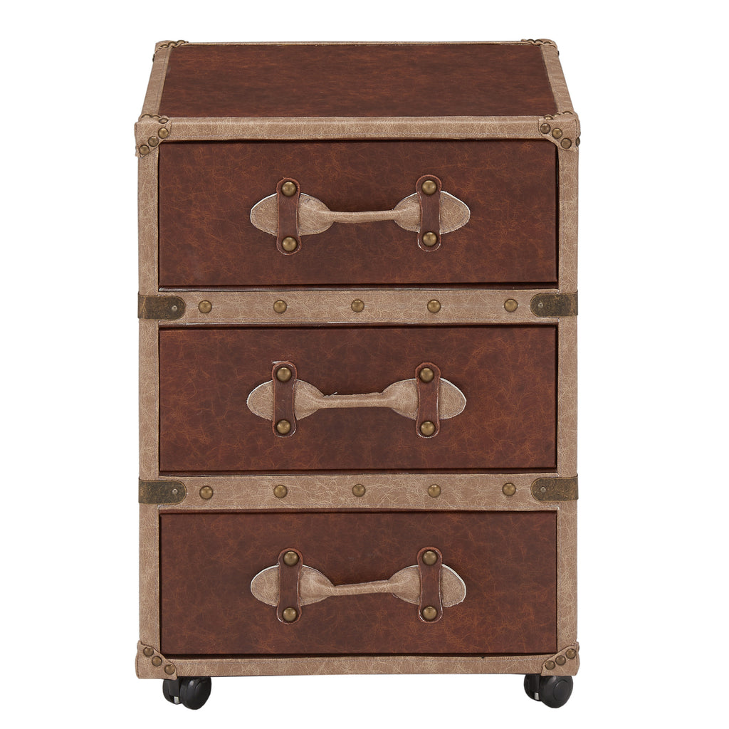 - Weathered, brown faux leather upholstery with beige faux leather framing and accents