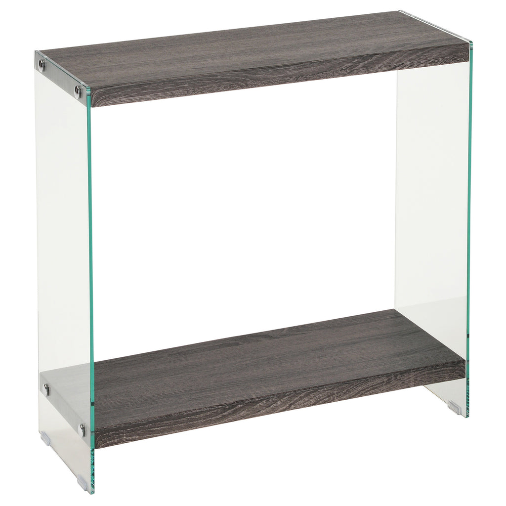 - Faux wood veneer with textured grain detail in a grey reclaimed finish