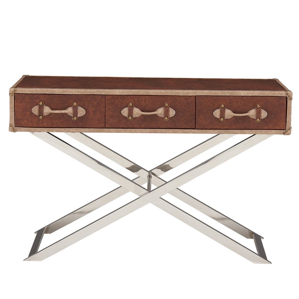 - Weathered, brown faux leather upholstery with beige faux leather framing and accents